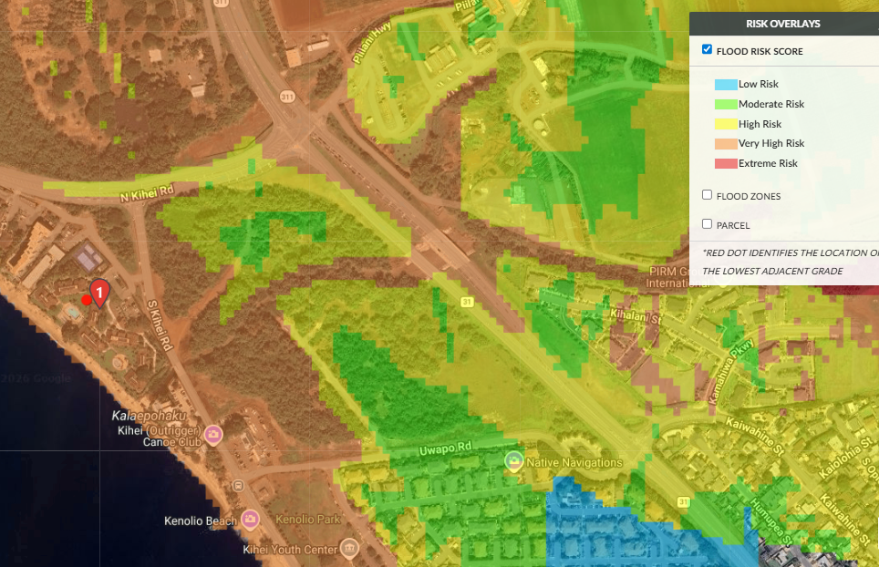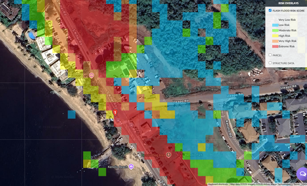 Figure: Map of Cotality Flash Flood Risk Score in area surrounding South Kihei Road in Maui, Hawaii