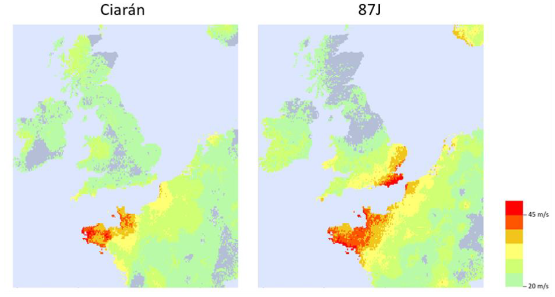 Ciarán was reminiscent of 87J in terms of location and intensity. Both storms underwent explosive intensification as they reached the UK. However, 87J’s storm track differed enough from Ciarán to create a much more damaging footprint in both the UK and France, as shown on the right side of Figure 1.