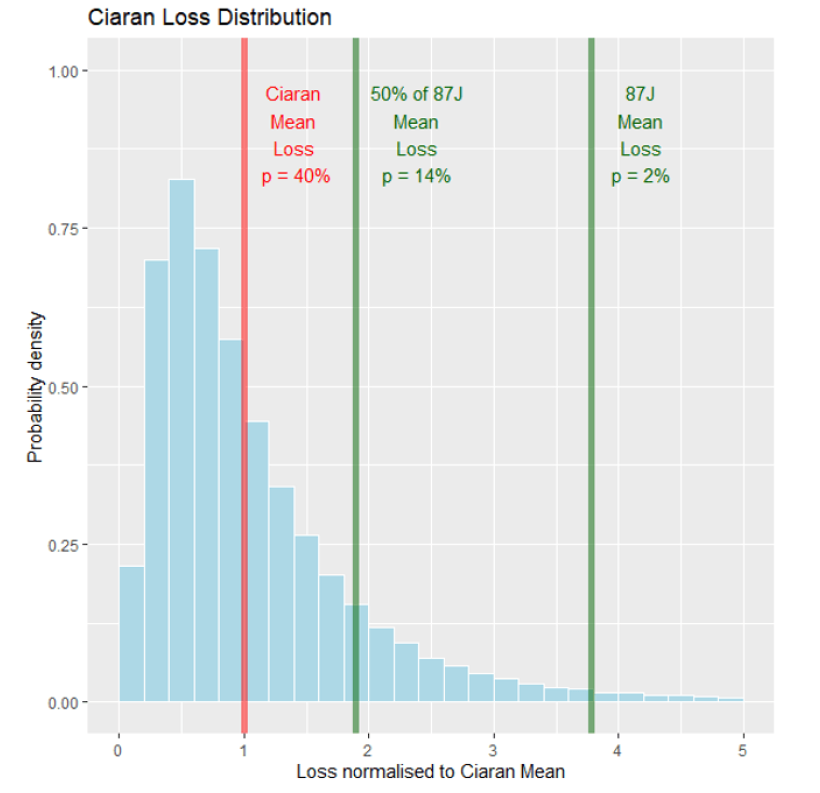 The right-most green vertical line in Figure 2 shows the loss due to the 87J footprint. There is only a 2% chance that Ciarán could have reached this level, but there is a modest 14% chance of reaching half (left-most green, vertical line) the 87J loss.
