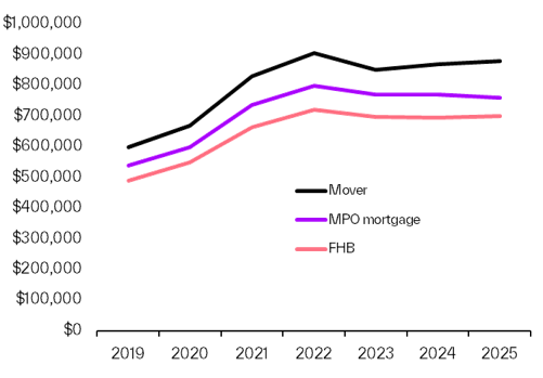 So far in 2025, mortgaged MPOs nationally have paid a median of $759,000, slightly down from $770,000 in 2024. That’s higher than the $700,000 median first home buyers have paid (up from $695,000 last year). Movers have paid $880,000 this year compared to $870,000 in 2024.