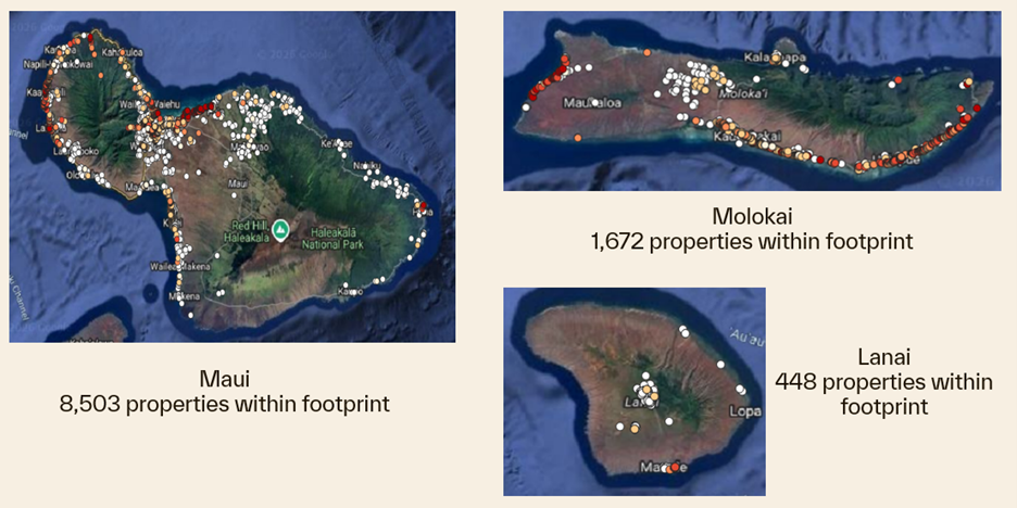 Figure: Total number of properties within the flood footprint on Maui, Molokai, and Lanai