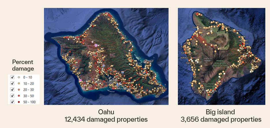 Figure: Total number of properties damaged and their percentage damage within the flood footprint on Oahu and Big Island