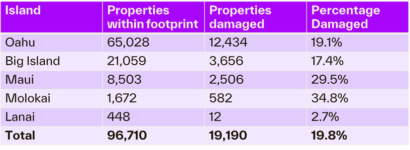 Figure: Total number of properties damaged and their percentage damage within the flood footprint on Maui, Molokai, and Lanai